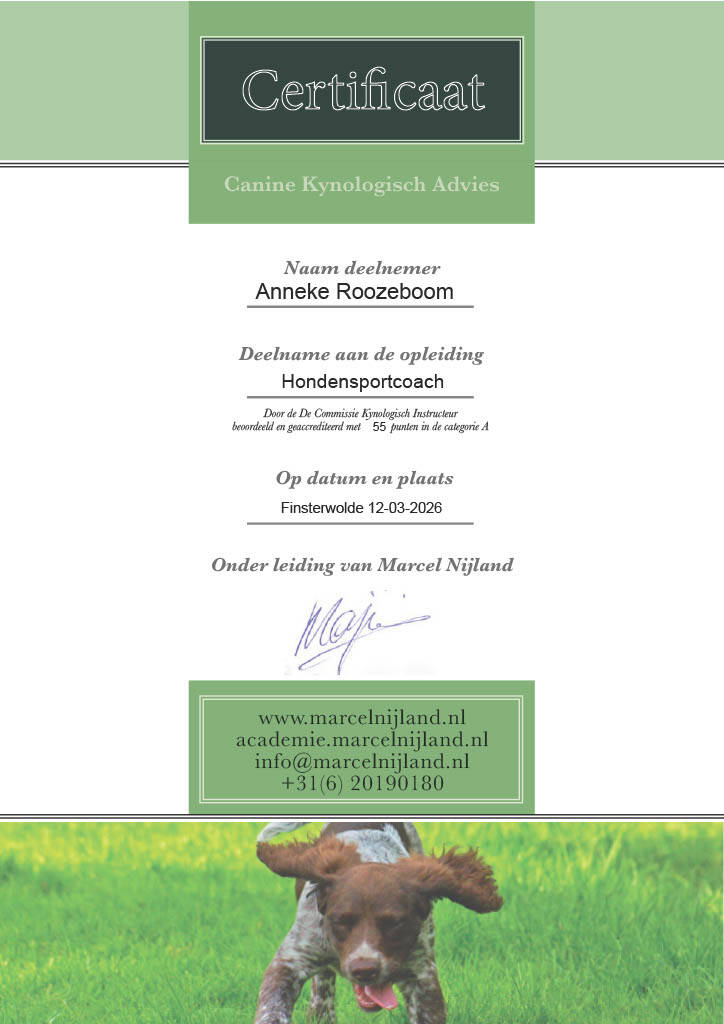 Ik zeg zeker niet snel dat iets me tegenvalt. Hier is dat zeker het geval bij het praktijkgedeelte. De theorie vond ik wel super, maar ook daarin werd geen aandacht gegeven aan de oefeningen. Dat vind ik toch wel een groot nadeel. Zeker voor een geaccrediteerde opleiding. Maar goed, ik mag me dus nu wel officieel hondensportcoach noemen.